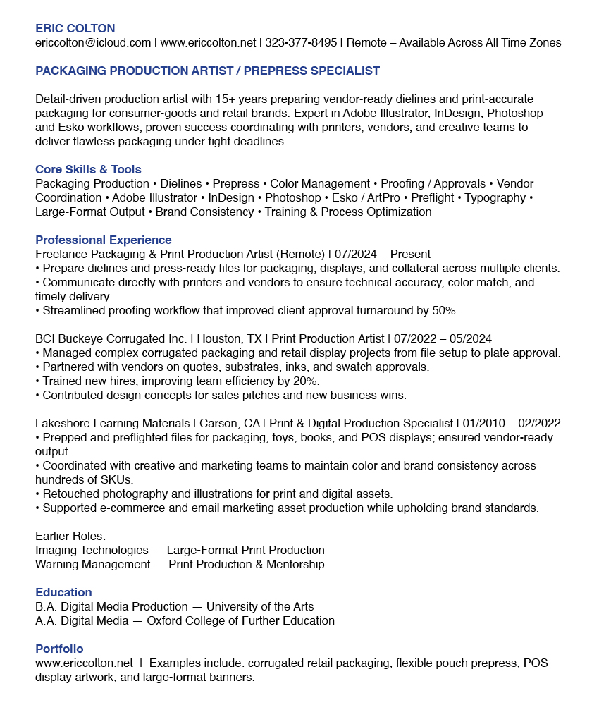 Eric Colton is a seasoned pre-press & digital production artist with 15+ years of experience in preparing high-quality materials. His expertise spans color management, layout design, and print readiness, making him a valuable asset for any creative project requiring precision and professionalism.